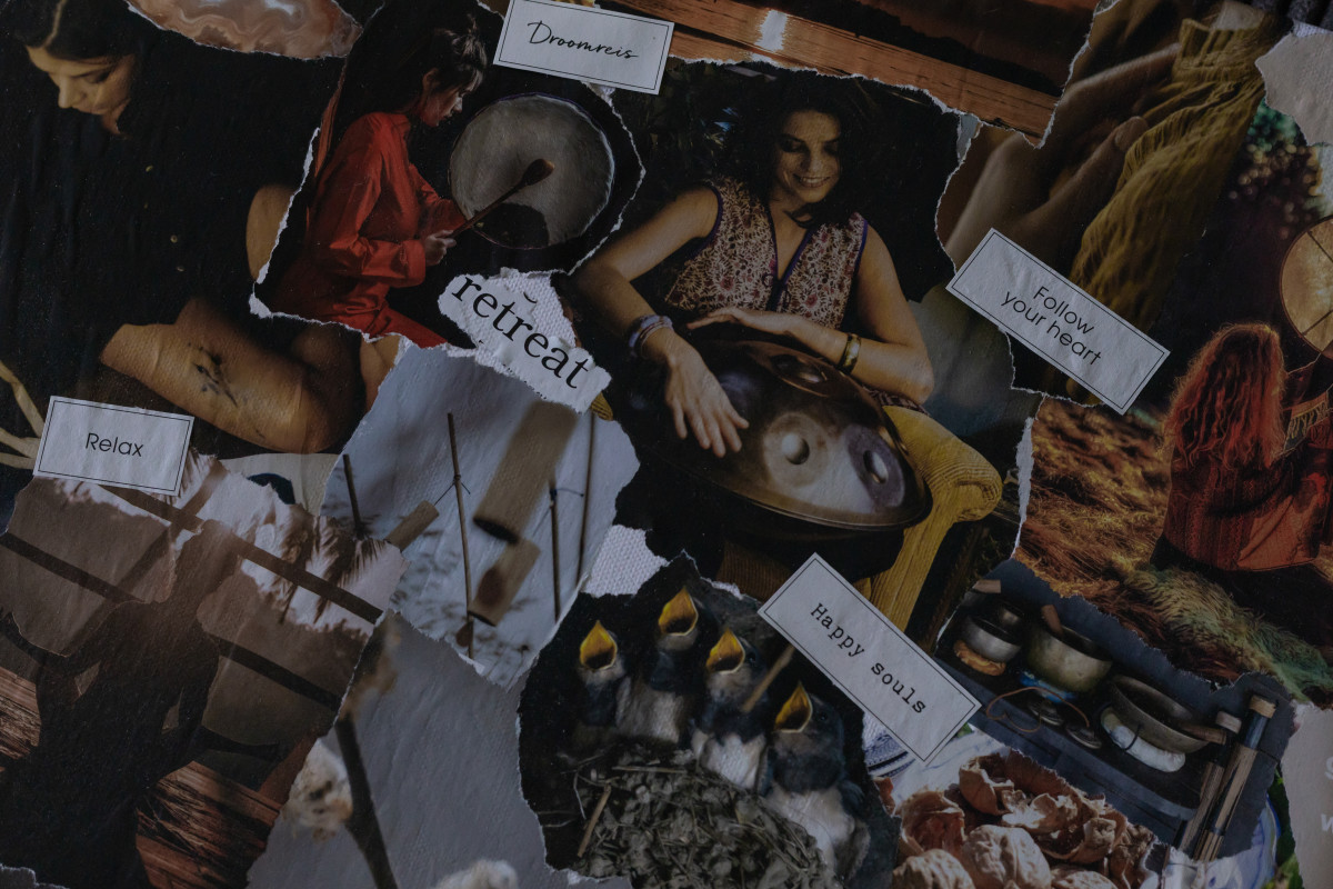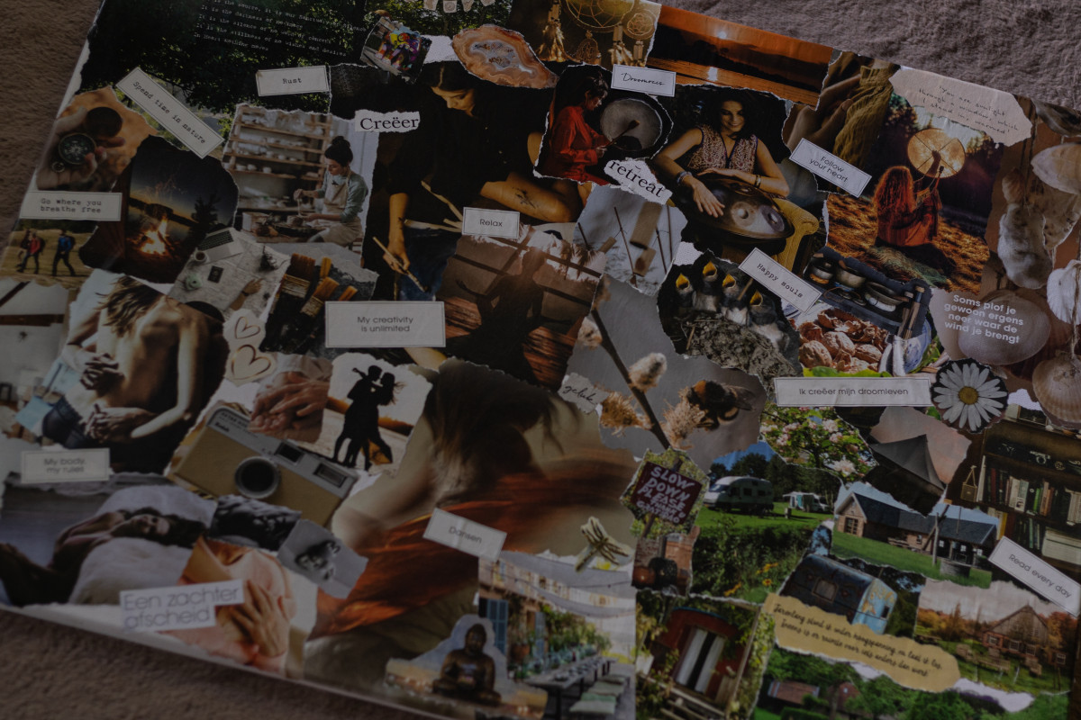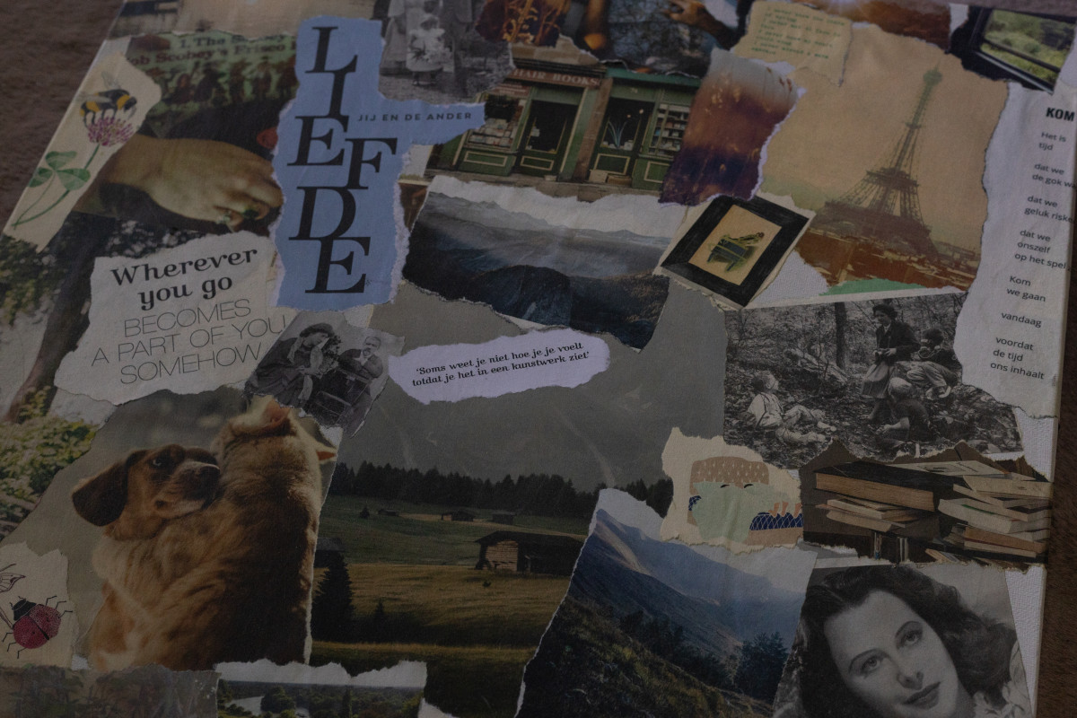 Wanneer mijn hoofd overuren draait, hou ik er enorm van om dingen vanuit mijn hoofd te visualiseren met een moodboard. Het laat je onbewust inzicht geven in de dingen waar je over nadenkt. Blader door magazines en scheur uit waar je aandacht naar toe gaat. Nadat je een mooie verzameling bij elkaar hebt gescheurd zul je de teksten en afbeeldingen op je canvas gaan aanbrengen.