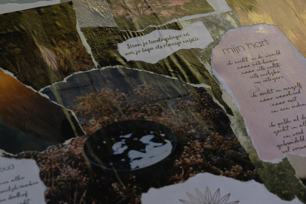 Eerst lekker vrij schuiven en dan kun je ze vastlijmen. Voor nu een leuke sfeervolle plaat die je wellicht inzicht geeft in je gedachten, maar voor over een jaar een prachtig stuk om op terug te kijken wat er een jaar geleden door je hoofd ging en hoe je daar nu naar kijkt. Deze workshop is ook erg mooi om aan je werknemers aan te bieden. Hiervoor kan ik op het bedrijf langskomen om de workshop te geven.